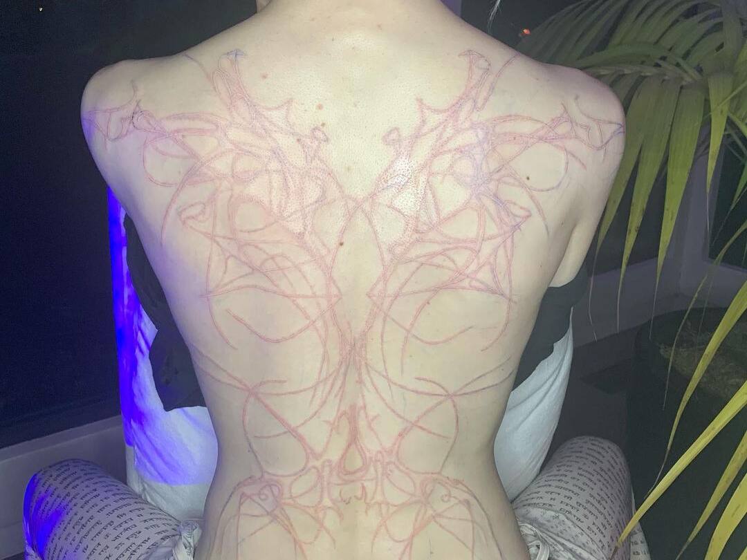 Alien Narben Grimes Zeigt Ihr Riesiges Rucken Tattoo 20 Minuten